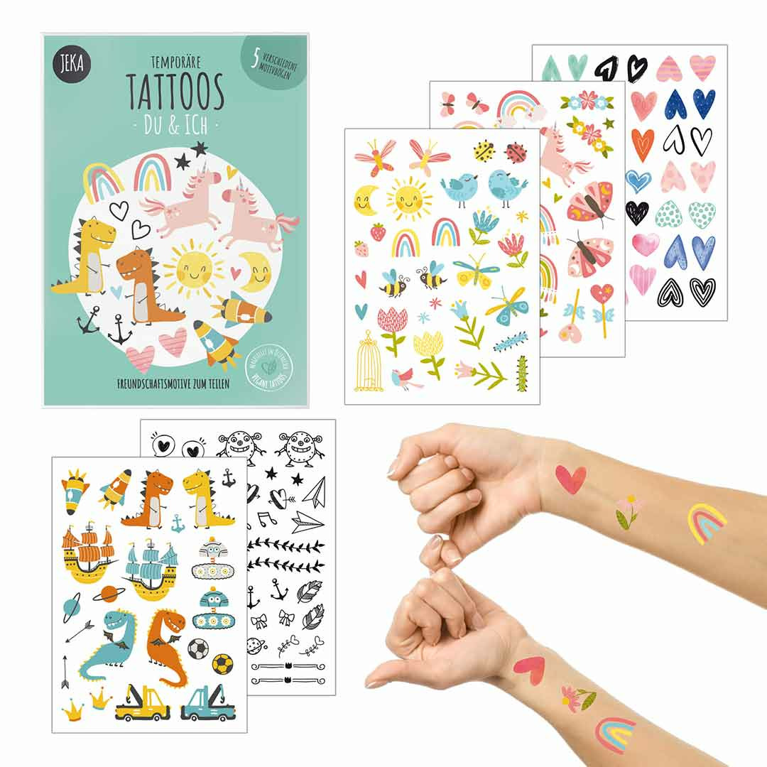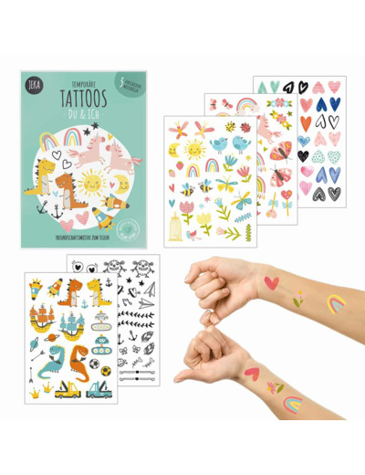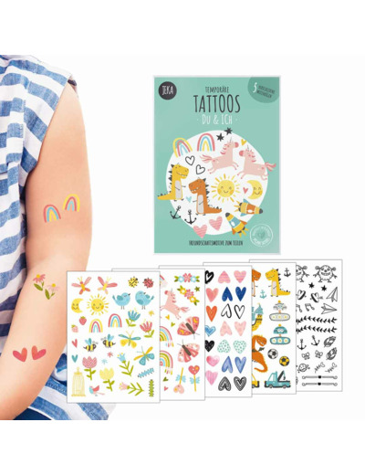 Nos tatouages colorés et originaux de la marque vegan et éco-responsable Jeka sont un jeu d'enfant à utiliser et à enlever. A l'intérieur du paquet, 5 planches de tatouages éphémères bio. Découpez le modèle qui vous plaît, enlevez la pellicule, un peu d'eau, appliquez une minute sur la peau et hop... le tour est joué! La garantie pour vos enfants de passer un moment ludique en famille ou entre amis.