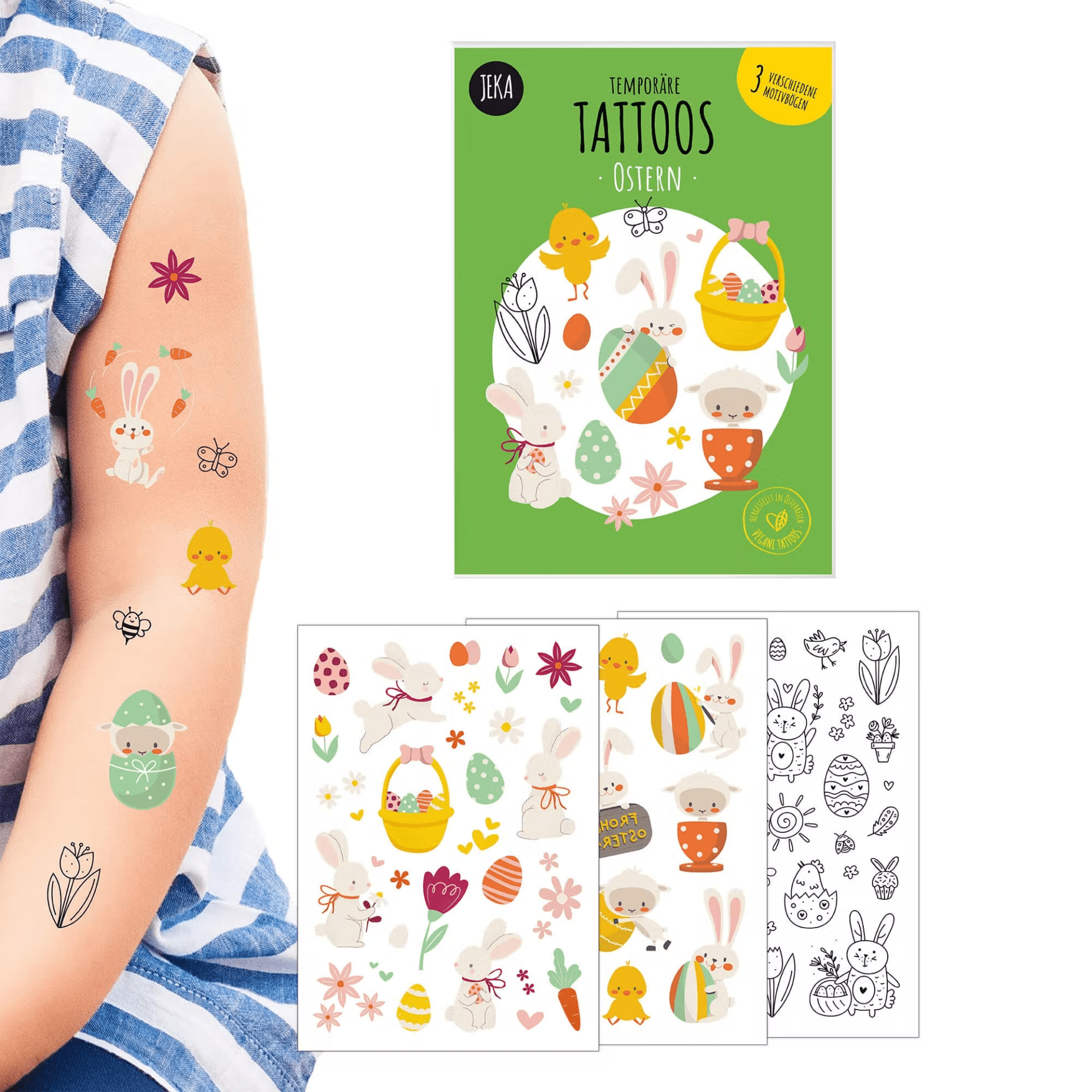 Nos tatouages colorés et originaux de la marque vegan et éco-responsable Jeka sont un jeu d'enfant à utiliser et à enlever. A l'intérieur du paquet, 5 planches de tatouages éphémères bio. Découpez le modèle qui vous plaît, enlevez la pellicule, un peu d'eau, appliquez une minute sur la peau et hop... le tour est joué! La garantie pour vos enfants de passer un moment ludique en famille ou entre amis.
