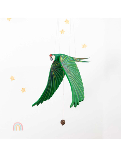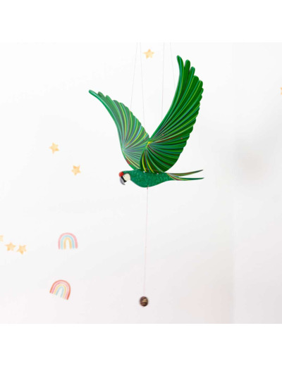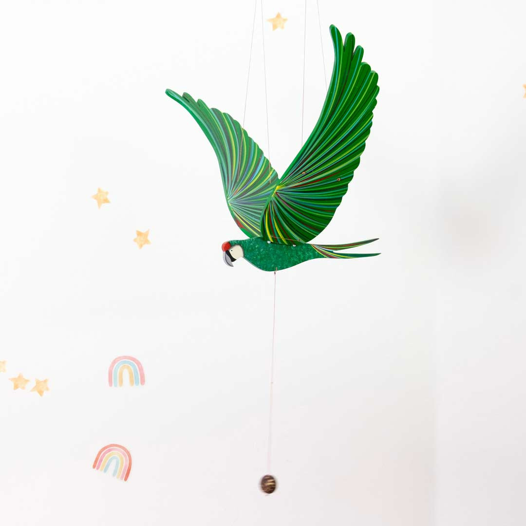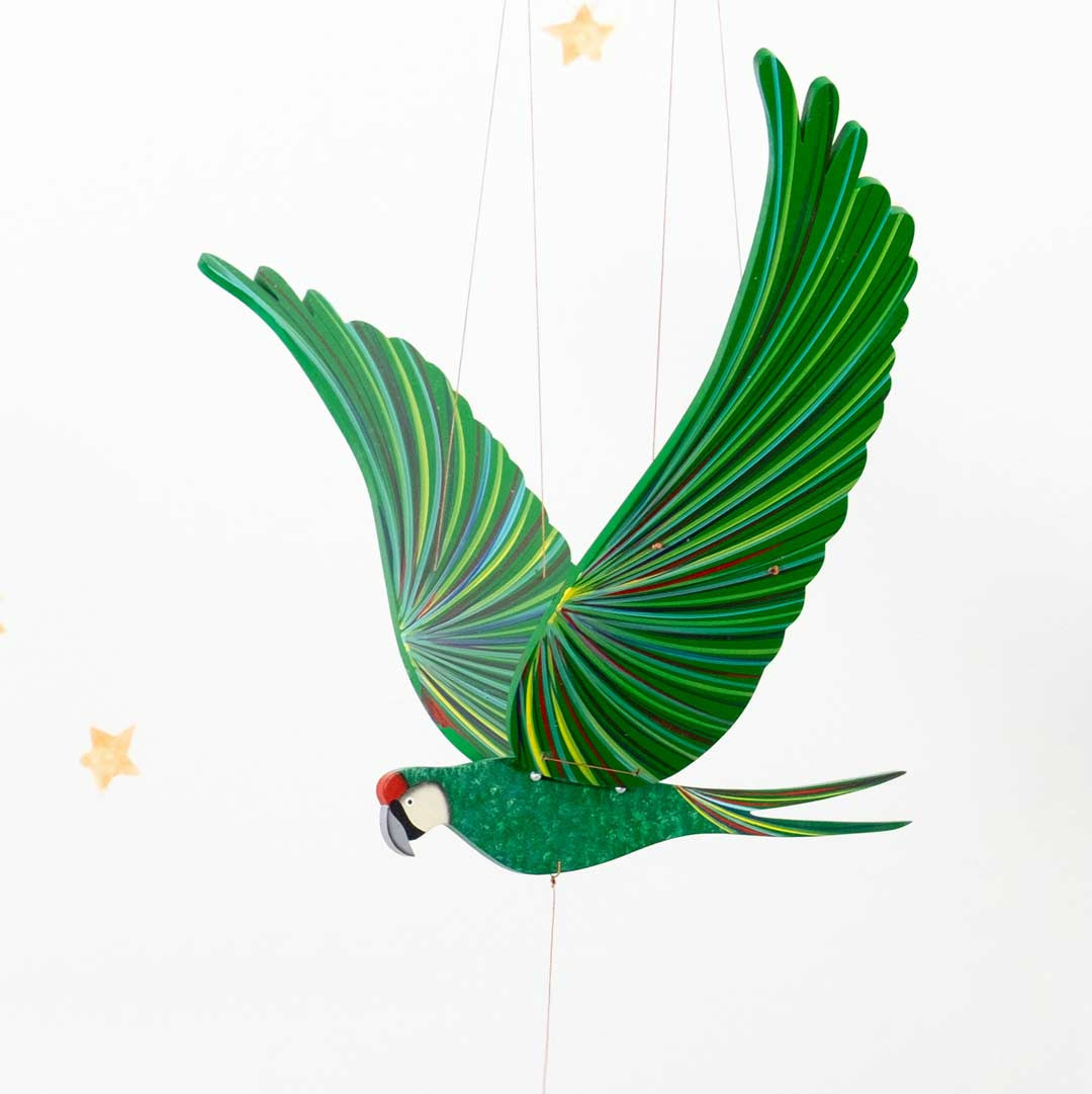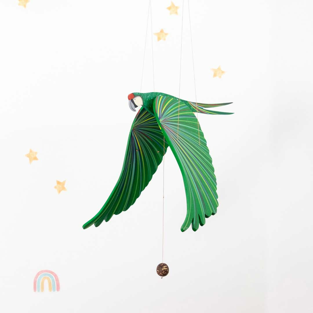 Mobile artisanal en bois – Perroquet Ara Vert, un cadeau de naissance écoresponsable pour bébé