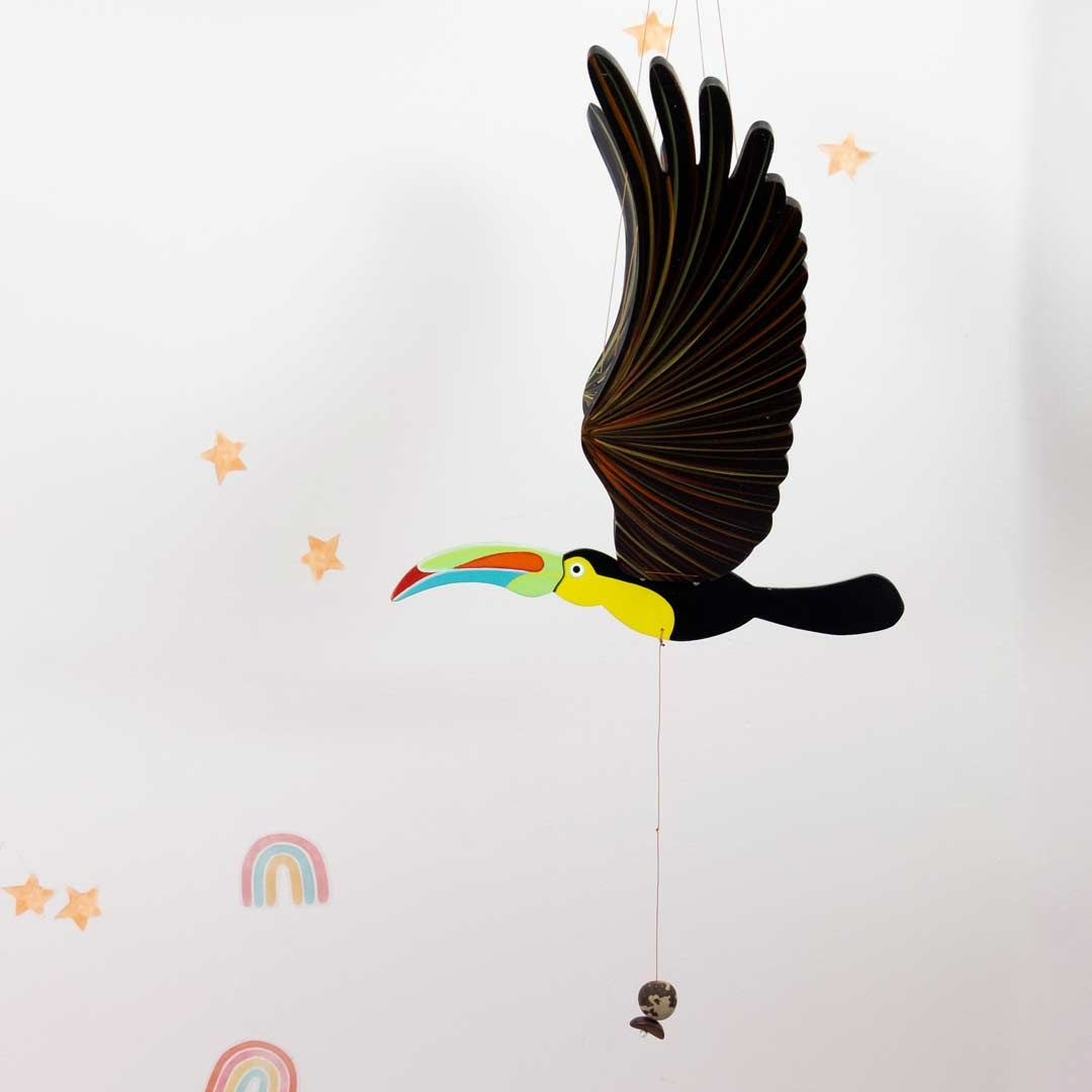Mobile artisanal en bois – Toucan, un cadeau de naissance écoresponsable pour bébé