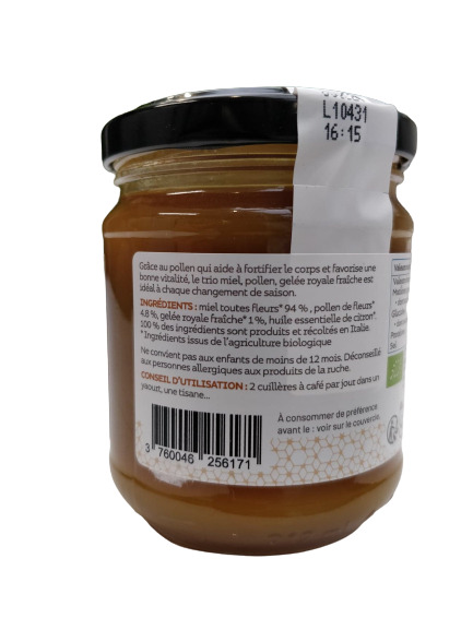 Miel toutes fleurs* 94 %, pollen de fleurs 4.8 %, gelée royale fraîche*1 %, huile essentielle de citron*.