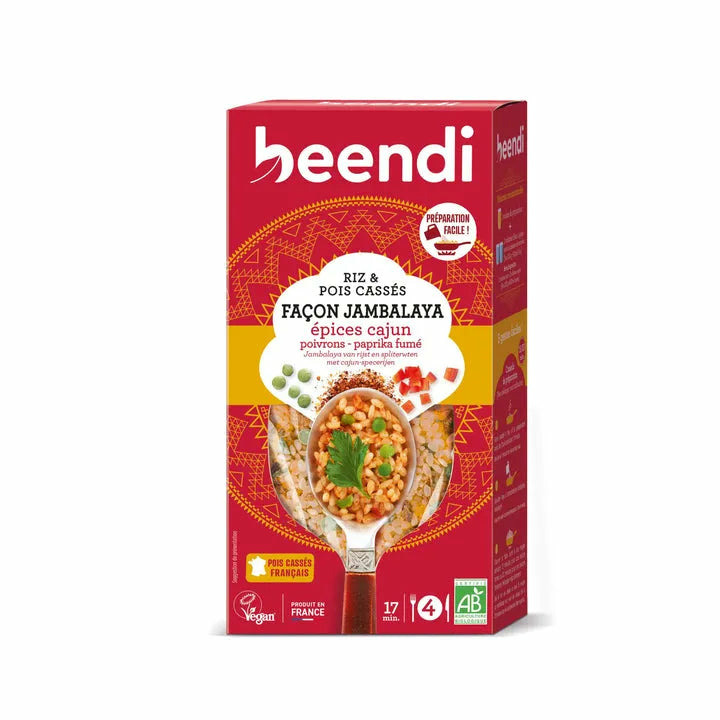 Un mélange authentique de riz rond et pois cassés bio, relevé d'épices cajun traditionnelles, pour un plat complet et savoureux prêt en moins de 20 minutes.