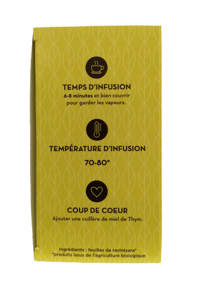 Avec cette infusion, retrouvé les vertus de l'huile essentielle de Ravintsara en beaucoup plus doux.