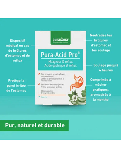 Pura-Acid Pro® est un dispositif médical de classe I conçu pour soulager les brûlures d’estomac, le reflux acide et le reflux gastro-œsophagien (RGO). Ces comprimés à mâcher au goût menthe combinent des minéraux (carbonate de calcium, hydroxyde de magnésium) et des plantes apaisantes (aloé vera, guimauve, mauve) pour une double action : neutralisation de l’acide gastrique et protection des muqueuses irritées. Testé pour l’absence de métaux lourds, pesticides et micro-organismes, ce produit 100 % bio et végan garantit un soulagement rapide (jusqu’à 4 heures) sans perturber la digestion. Fabriqué selon les normes IFS et approuvé par l’Agence alimentaire belge, il convient à un usage prolongé, même pour les femmes enceintes.