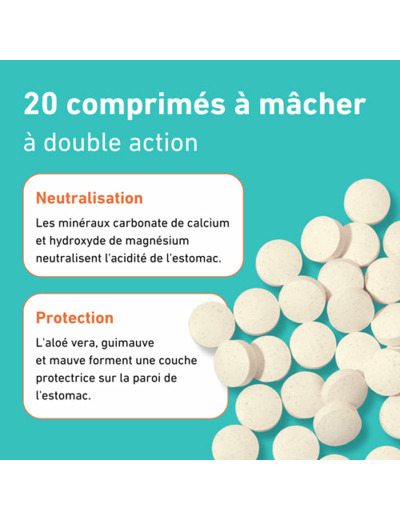 Ponctuel : Mâchez lentement 1 comprimé lors d’une crise de brûlures d’estomac ou de reflux.