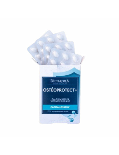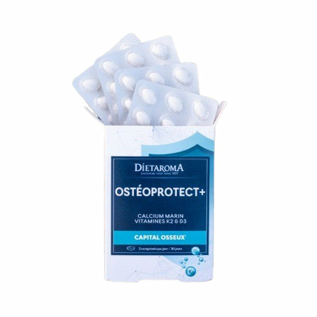 Pour contribuer au maintien de votre capital osseux tout au long de la vie, DIETAROMA propose le complément alimentaire Ostéoprotect Calcium Marin + Vitamine K2 et D3 ! Une formule renforcée du produit ostéoprotect éprouvé depuis 20 ans.