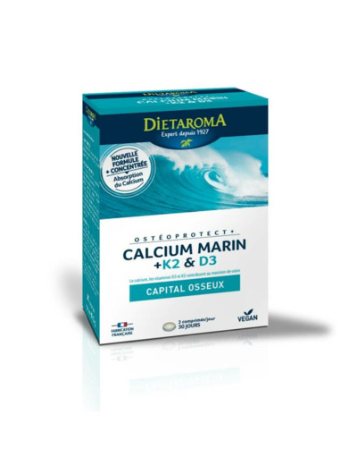 Pour contribuer au maintien de votre capital osseux tout au long de la vie, DIETAROMA propose le complément alimentaire Ostéoprotect Calcium Marin + Vitamine K2 et D3 ! Une formule renforcée du produit ostéoprotect éprouvé depuis 20 ans.