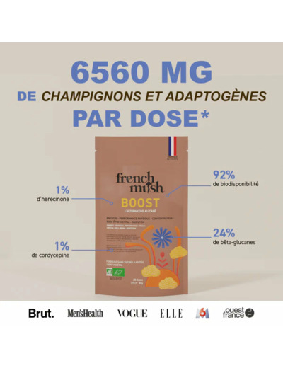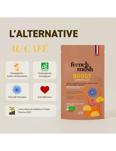 Commandez votre Boisson Chicory Boost Bio Chicorée et Champignons 80 g de French Mush sur Pleine-forme.net et profitez d’une alternative bio gourmande au café pour une énergie stable, une concentration accrue et un confort digestif optimal au quotidien !