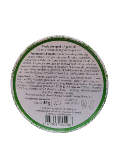 Gomme arabique (acacia); saccharose* (sucre roux); sirop de blé*; macérats glycérinés de bourgeons : cassis*(ribes nigrum) -32 mg, noisetier* (corylusavellana) - 32 mg ; huiles essentielles : eucalyptus globuleux* ((eucalyptus globulus) - 52,8 mg, pin sylvestre* (pinus sylvestris) - 19.2 mg, menthe verte* (mentha spicata) - 14.4 mg, menthe poivrée* (mentha x piperita) - 9.6 mg.