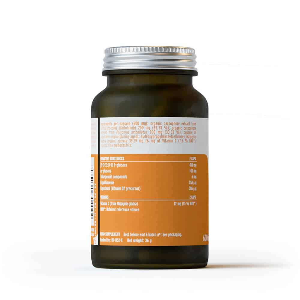 60 gélules (600 mg). Chaque gélule contient 200 mg d’extrait HdT de Maitake bio (Grifola frondosa T1178- Grifolumib®), 200 mg d’extrait HdT de Polypore bio (Polyporus umbellatus T1666), 35,29 mg de poudre d’acérola bio (Malpighia glabra), maltodextrine de riz bio.