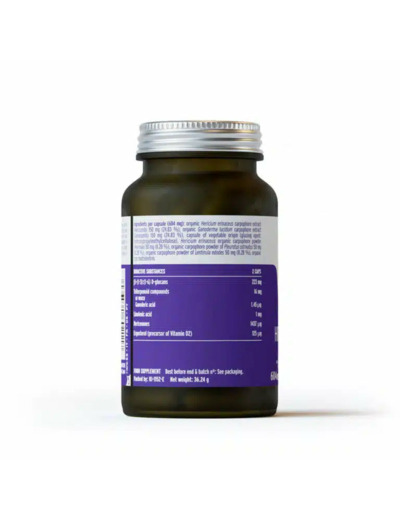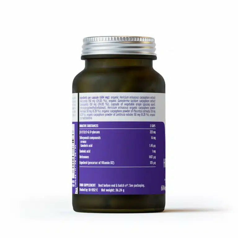 Chaque gélule contient 150 mg d’extrait d’Hericium erinaceus bio (Herizumib®), 150 mg d’extrait de Ganoderma lucidum bio (Ganozumib®), 50 mg de poudre d’Hericium erinaceus bio (Herimax®), 50 mg de poudre de Pleurotus ostreatus bio et 50 mg de poudre de Lentinula edodes bio, maltodextrine de riz bio.