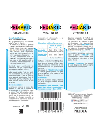 Découvrez le produit Vitamine D3 Pediakid, 200Ui, 20ml du laboratoire Ineldea.