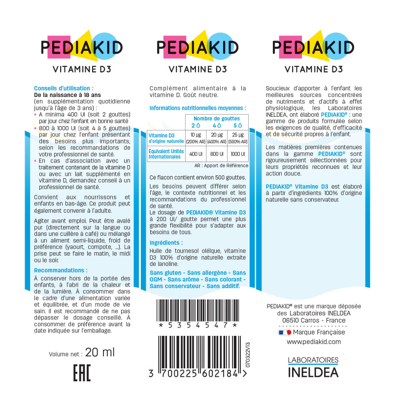 Découvrez le produit Vitamine D3 Pediakid, 200Ui, 20ml du laboratoire Ineldea.