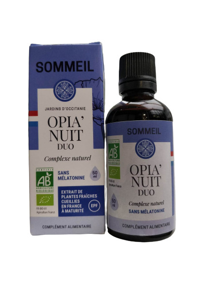Découvrez le complexe d'extrait de plantes fraiches pour le sommeil, Opia'Nuit Duo, 50ml de Jardins d'Occitanie.