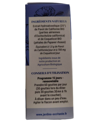 Extrait hydroalcoolique (25°) de Pavot de Californie Bio, (parties aériennes) et de Coquelicot Bio (pétales).
