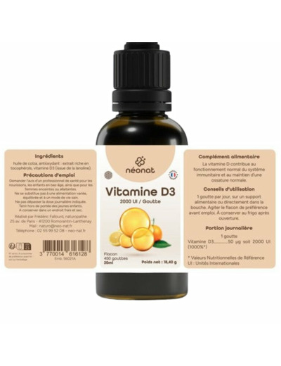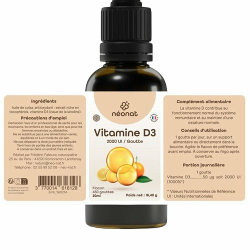 Renforcez votre immunité et soutenez vos os avec la Vitamine D3 2000 UI – 30 ml – Néonat, une formule liquide naturelle à base d’huiles végétales de colza et d’olive pour une biodisponibilité exceptionnelle !