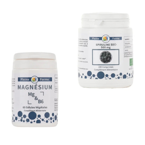Ce pack associe deux compléments alimentaires phares : le Magnésium B6 et la Spiruline Bio de Pleine Forme. Ensemble, ils agissent en synergie pour vous offrir une formule complète et efficace pour lutter contre la fatigue, améliorer votre concentration et renforcer votre système immunitaire.