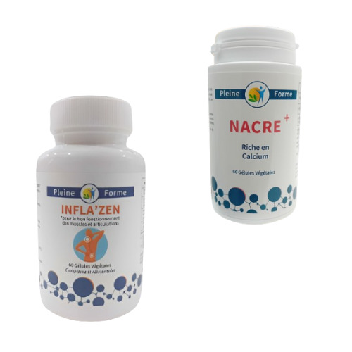 Il associe deux compléments alimentaires phares : la Nacre et l'Infla'Zen de Pleine Forme. Ensemble, ils agissent en synergie pour favoriser le confort articulaire, réduire l'inflammation et améliorer la mobilité.
