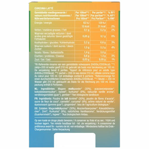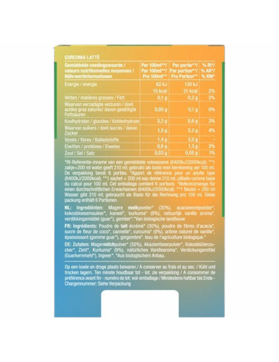 Le Curcuma Latte Purasana est une boisson instantanée bio inspirée du lait doré traditionnel, combinant curcuma, gingembre, cannelle, sucre de fleur de coco et un arôme naturel de vanille. Certifié biologique, sans gluten, soja ou additifs synthétiques, ce latte contient 30 % de poudre de lait écrémé bio et des fibres d’acacia pour une texture crémeuse. Chaque stick (3 g) se dissout dans 200 ml d’eau ou de lait chaud pour une boisson chaude et réchauffante. Testé pour l’absence de métaux lourds, pesticides et micro-organismes, il répond aux normes strictes de l’Agence alimentaire belge et de l’IFS, garantissant une qualité premium.