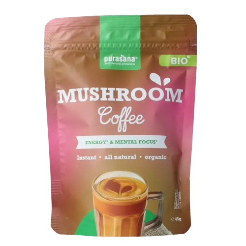 Mushroom Coffee Bio 45 g est un café instantané fonctionnel élaboré par Purasana, spécialiste des superaliments bio. Il combine :