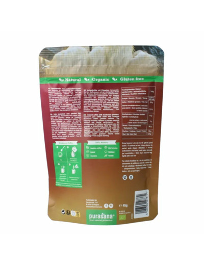 Sachet refermable de 45 g (≈ 15 portions de 3 g), certifié bio, vegan, sans gluten ni soja.