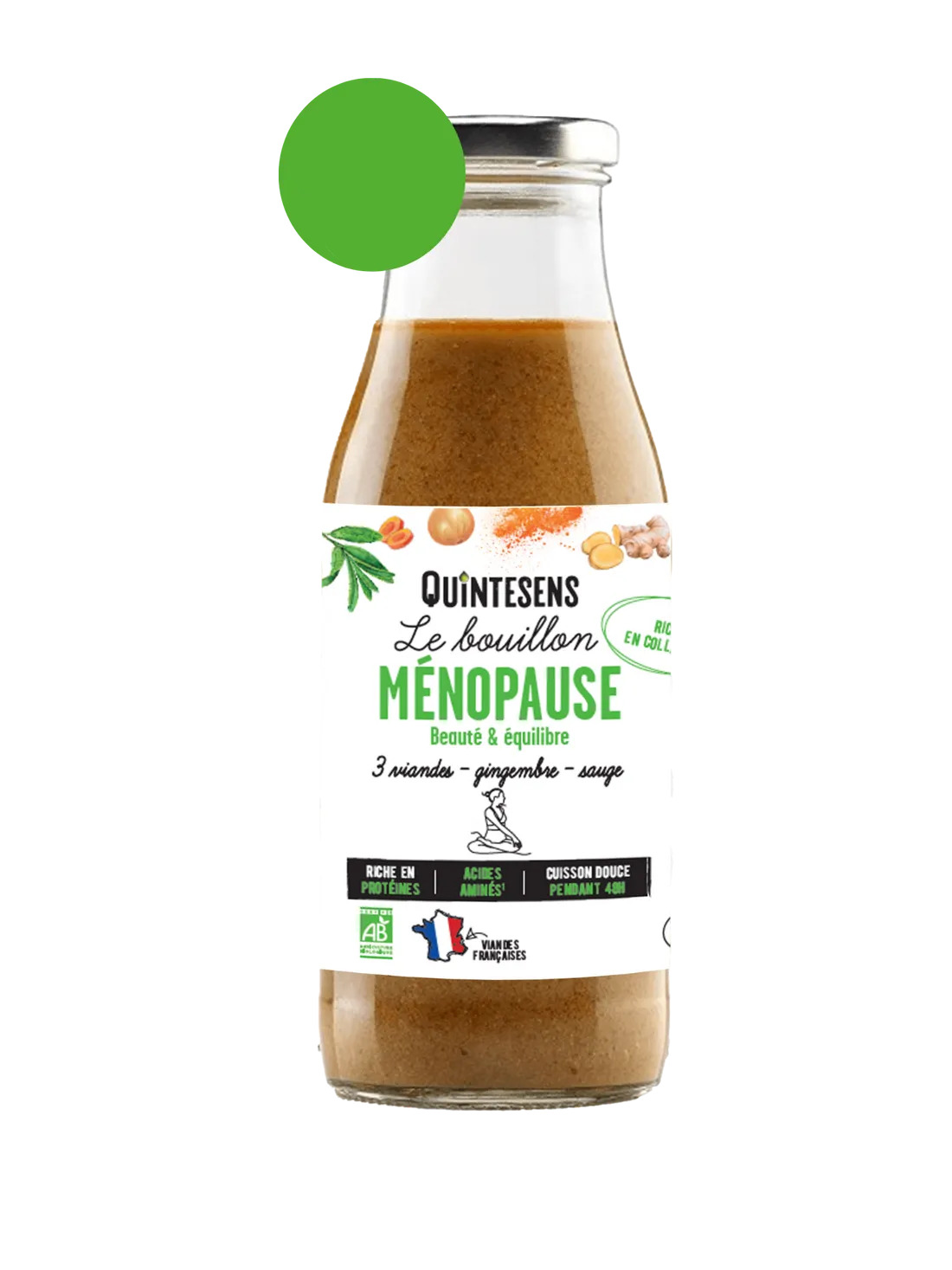 Le Bouillon Ménopause Quintesens est un bouillon d’os bio ultra-nutritif, élaboré à partir de viandes et os français (bœuf, poulet, pieds de veau) mijotés 48 heures avec des légumes, épices et super-aliments comme la sauge, le miso et le shiitake. Testé par un laboratoire indépendant, il offre une haute concentration de collagène naturel (acides aminés comme la glycine et la proline) et de minéraux pour répondre aux besoins spécifiques des femmes en ménopause. Avec 96 % d’ingrédients français et une fabrication artisanale à Michelbeke (Belgique, à 1h de Lille), ce bouillon sans additifs est idéal pour apaiser les symptômes, renforcer la peau, les os et favoriser le bien-être général.