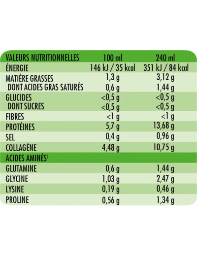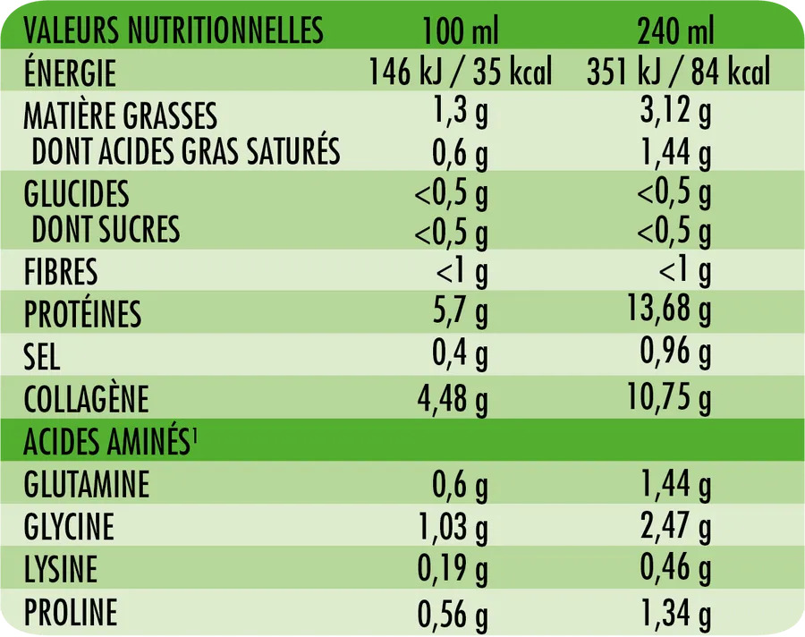 Collagène : Environ 10.75 g/240 ml (basé sur des bouillons similaires).