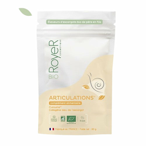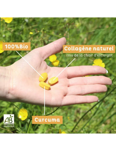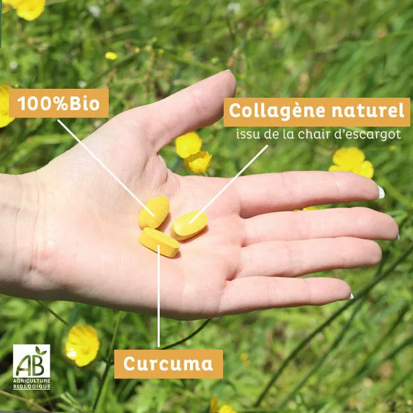 Un complément alimentaire biologique sous forme de comprimés, combinant chair d'escargot riche en collagène et extrait de curcuma, pour soutenir la santé de vos articulations de manière naturelle et efficace.