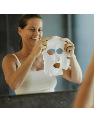 Présentation : Sachet contenant 1 masque tissu en coton bio imprégné de 15 ml de sérum.