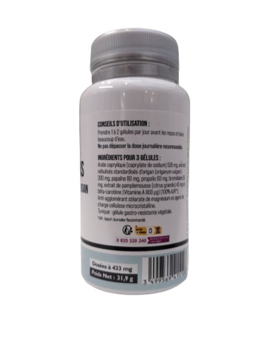 Acide Caprylique (535 mg), Origanum vulagre (300 mg), Propolis (60mg),), Extrait Citrus Paradisi (90 mg), Carica Papaya (80 mg), Bromélaine (50 mg), stéréate de pamplemousse (45 mg), bétacarotène à 10% (0,800 mg soit 100% des AJR). Gélule végétales