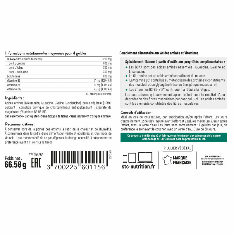 Ingrédients : acides aminés (L-glutamine, L-leucine, L-valine, L-isoleucine), gélule végétale (HPMC, colorant : complexe cuivrique de chlorophyllines), émulsifiant : stéarate de magnésium, vitamines B2-B6-B12.