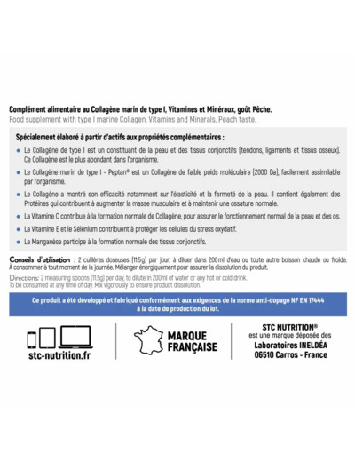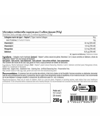 Collagène marin hydrolysé (poisson) - Peptan®, arôme naturel de pêche, Vitamines C et E, levure enrichie en Sélénium, citrate de Manganèse.