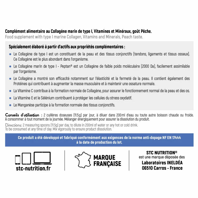 Le Collagen DUO de STC Nutrition est un complément alimentaire sous forme de poudre aromatisée à la pêche, élaboré à base de collagène marin de type I, de vitamines C et D, de sélénium et de manganèse. Il est conçu pour soutenir la santé de la peau, des articulations, des os et des muscles.