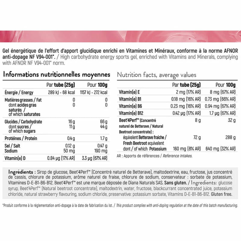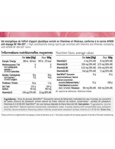 Ingrédients : Sirop de glucose, Concentré naturel de Betterave - Beet’4Perf™, maltodextrine, eau, fructose, jus concentré de cassis, chlorure de potassium, arôme naturel de fraise, chlorure de sodium, conservateur : sorbate de potassium, Vitamines D-E-B1-B6-B12. Beet’4Perf™ est une marque déposée de Diana Naturals SAS. Sans allergène - Sans gluten