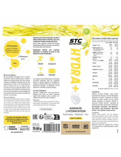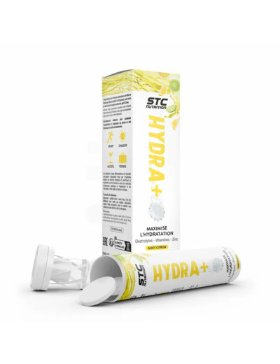 Les HYDRA+ STC Nutrition sont des pastilles effervescentes qui enrichissent l’eau en minéraux essentiels (électrolytes), zinc et vitamines pour une hydratation de qualité. Leur formule isotonique, combinant glucides et électrolytes, favorise une absorption optimale de l’eau par l’organisme, essentielle pour éviter la déshydratation, qui peut entraîner fatigue, crampes ou troubles de la concentration. Avec un arôme naturel de citron, ces pastilles offrent une solution pratique et savoureuse pour sportifs, voyageurs, fêtards ou toute personne souhaitant maintenir un équilibre hydrique. Fabriquées par STC Nutrition (Ineldea), elles sont 100 % véganes, sans aspartame, colorants ni conservateurs, et testées pour leur pureté.