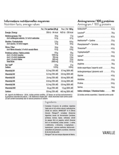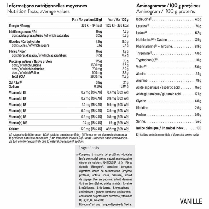 Ingrédients : Complexe tri-source de protéines végétales (soja, pois et riz), poudre de cacao maigre (CHO), arômes naturels, maltodextrine (VAN), citrate de calcium, AMINOLISE® 1.4 % [Fibres d’acacia Fibregum™, complexe d’enzymes digestives issues de fermentation (amylase, protéase, lactase, lipase, cellulase), extrait de papaye titré en papaïne, extrait d’ananas titré en bromélaïne], acides aminés : L-valine, L-méthionine, L-thréonine, L-tryptophane ; chlorure de sodium (CHO), épaississant : gomme xanthane, édulcorants : acésulfame de potassium, sucralose ; vitamines B1, B2, B3, B5, B6 et B12.