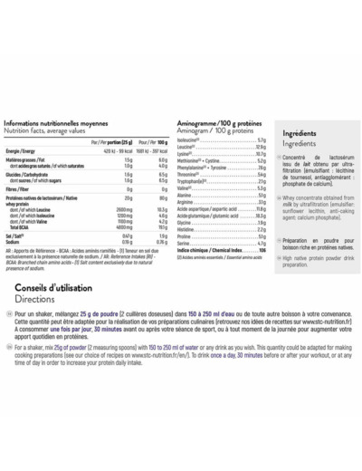 PURE WHEY Nature est un concentré de lactosérum, qui contient 80% de protéines natives de lait, soit 20 g par portion, dont 4.8 g de BCAA et a une faible teneur en sucres et en matières grasses.