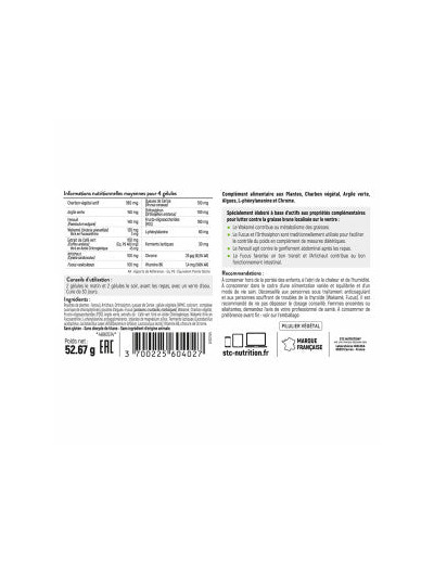 Ingrédients : Poudres de plantes : Fenouil, Artichaut, Orthosiphon, queues de Cerise ; gélule végétale (HPMC, colorant : complexe cuivrique de chlorophyllines), poudres d’algues : Fucus (poissons, crustacés, mollusques), Wakamé ; Charbon végétal, Fructo-oligosaccharides (FOS), Argile verte, extrait de Wakamé titré en fucoxanthine, Café vert titré en acide chlorogénique ; L-phenylalanine, ferments lactiques d’origine végétale (Lactobacillus