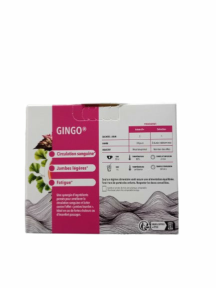 Retrouvez des jambes légères et une circulation fluide avec Gingo Bio – 18 Infusettes – Thé de la Pagode, une infusion bio spécialement formulée pour soulager les sensations de jambes lourdes, favoriser une bonne circulation sanguine et limiter les gonflements, particulièrement en période de chaleur ou de station debout prolongée. Grâce à une synergie unique de thé vert sencha bio, vigne rouge, baie de sureau, ginkgo biloba, hibiscus, verveine et citronnelle, cette infusion offre une action drainante et tonifiante naturelle. Certifiée bio, vegan et sans gluten, elle est idéale pour une cure quotidienne, avec un goût équilibré aux notes acidulées et zestées, pour un bien-être revitalisant.
