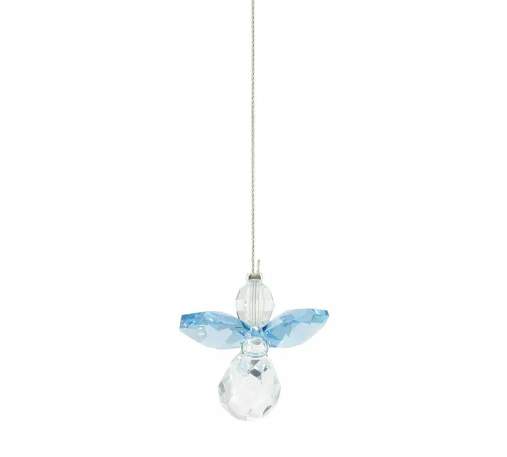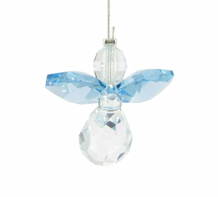 Description : Ange en cristal premium orné d’éléments aigue-marine, câble d’acier gainé de silicone pour une suspension sûre et discrète.