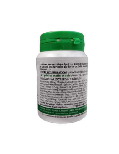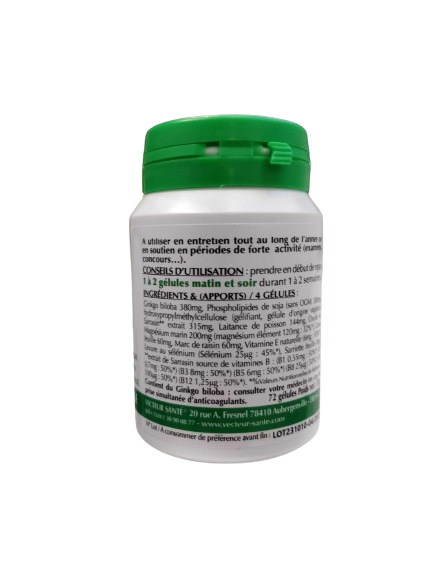 Ginkgo biloba 95mg, Phospholipides de soja (sans OGM) 95mg, cellulose (gélule végétale), Extrait de Sarrasin source de Vitamines B, Laitance de poisson 50mg, Magnésium d’origine marine, Cassis (Ribes nigrum) feuille 20mg, Marc de raisin 20mg, Germe de blé 10mg, Vit.E naturelle, Levure au sélénium, Sarriette (Satureia montana).