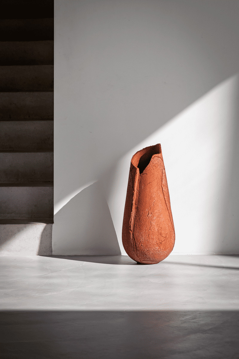 Desert vase est un vase en céramique sculpté à la main et conçu par l'artiste Belge Guy Buseyne. Des bords bruts, une texture rugueuse, un contour fluide et une teinte rouge terreux profond emmènent le spectateur dans un voyage d'un autre monde dans le désert. Cet objet de design est soigneusement fabriqué à la main dans un atelier de céramique artisanale au Portugal et ajoutera de la profondeur et de la hauteur à n'importe quel espace.