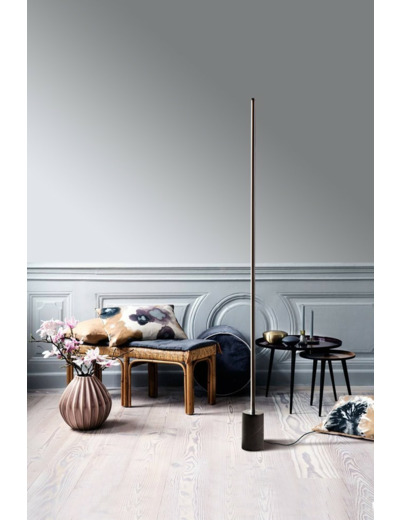 Tube en aluminium peinture époxy noir satin avec diffuseur en PMMA. Piètement marbre noir. Interrupteur sur cordon. Pivote sur sa base de marbre dotée d'une platine.