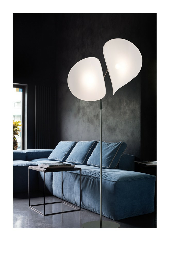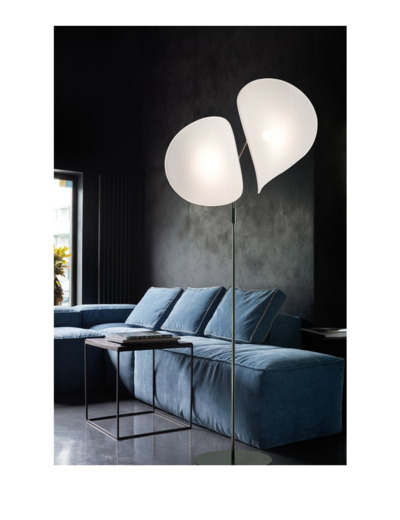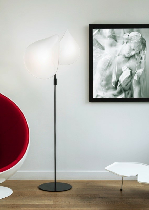 Le lampadaire MANTA se compose de deux larges écrans de tissu élastine tendu sur des cadres en fil d'acier. Les tubes cintrés formant des branches, la légèreté des écrans sont évocateurs d'un univers poétique. La lumière est orientable grâce aux rotules présentes au bout des branches.