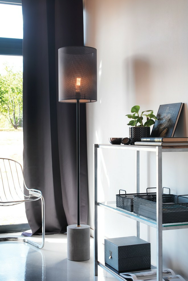 Dans un style très contemporain, le lampadaire TURENNE est monté sur un socle cylindrique en béton brut. Son abat-jour en tissu noir légèrement transparent apporte beaucoup de sophistication à l'ensemble dans une finition épurée et minimaliste. Il est également équipé d'un interrupteur sur cordon gainé noir. Pour une cohérence esthétique, nous préconisons une ampoule boule filament 4W LED.