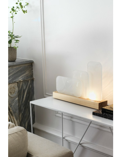 Quand fonctionnalité rencontre légèreté et transparence. Désacraliser le luminaire, lui qui se veut le plus souvent fragile et statique, voilà l'enjeu de cette lampe imaginée par la designer Harmonie HENRIO. Composée de trois feuillets de verre teintés à 75% d'opacité, cette lampe interpelle et trouve son sens dans la manipulation qu'en fera son utilisateur par un jeu de transparences et de formes.