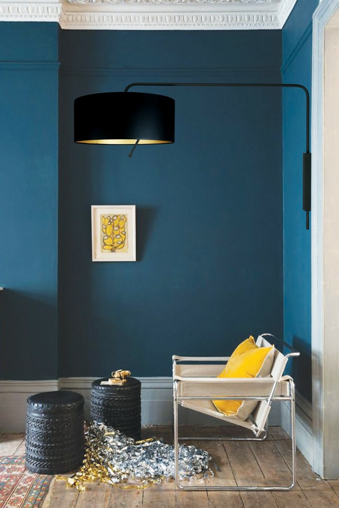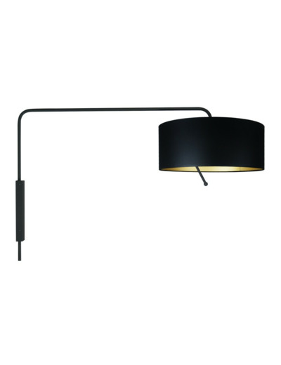 Une applique murale de grande dimension (profondeur 1m).. La MELIA est proposée dans une finition noire lisse satinée, avec support mural, bras et abat jour du même coloris. Grâce à sa poignée habilement positionnée, l'applique MELIA est orientable et permet de diriger la lumière avec précision au dessus d'un bureau, voire même d'un chevet. Son abat jour Ø50cm (intérieur doré).