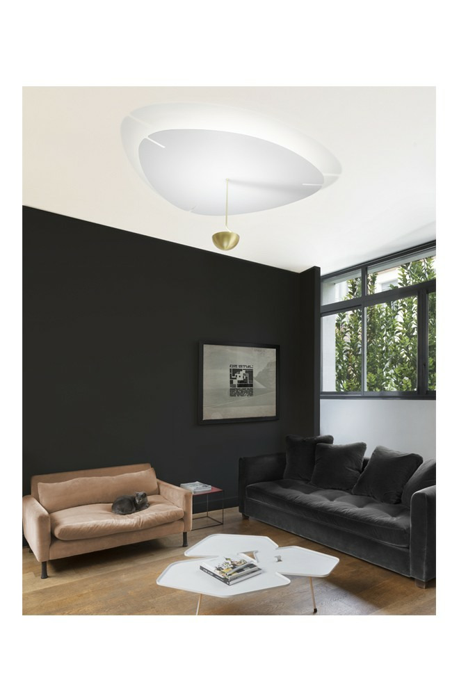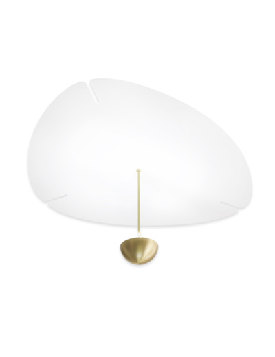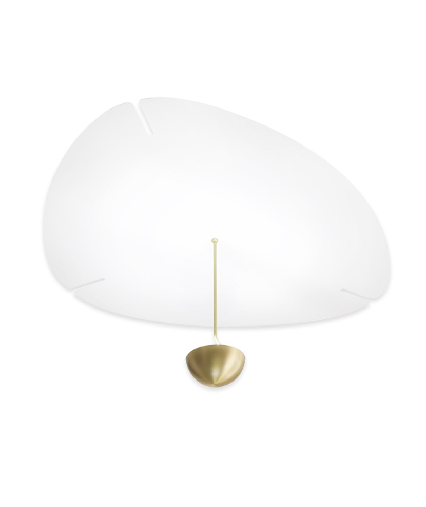 Eclairage indirecte et asservissement par commande numérique, Flow est conçu avec une platine en acier blanc texturé et une finition en laiton brossé verni satiné sur son tube et sa coupole.