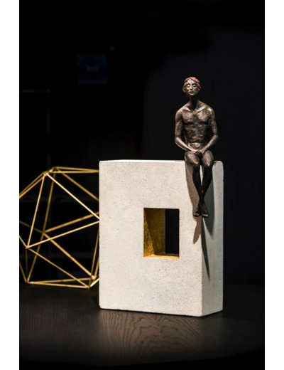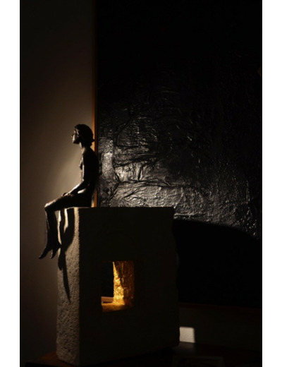 Pietra Filosofale dresse le portrait d'un artiste qui contemple son existence et son identité. A l'intérieur de la pierre se trouve de l'or pur qui confère à l'artiste lumière et spiritualité, lui permettant d'être enfin en paix avec lui-même. Elle est magnifiquement texturée et habilement patinée, ce qui lui donne une teinte riche. Il est encore plus fascinant lorsqu’il est éclairé par un projecteur dirigé vers le centre de la feuille d’or.
