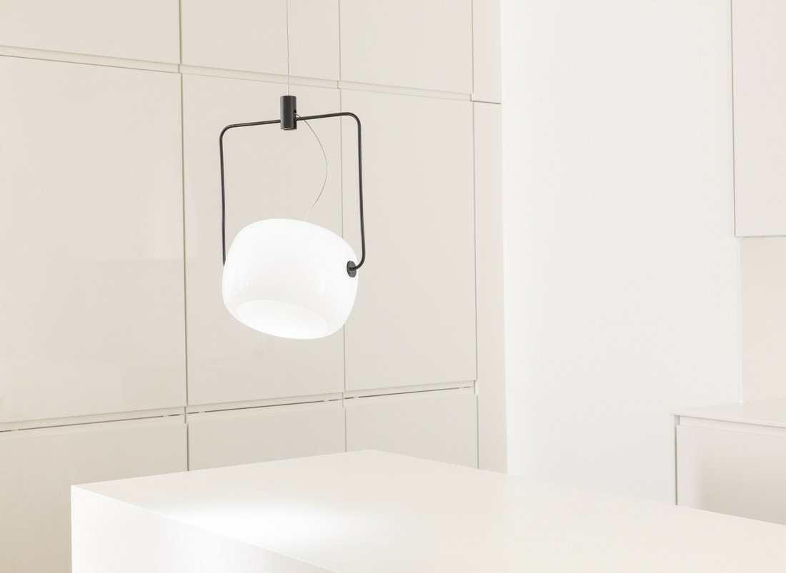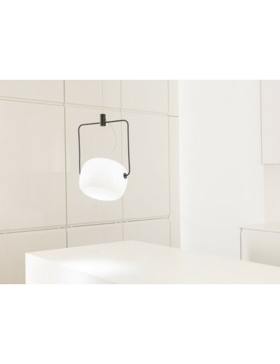 Enserré dans une structure en acier, le réflecteur opalin de la suspension GALET peut être orienté à loisir pour un éclairage optimal.